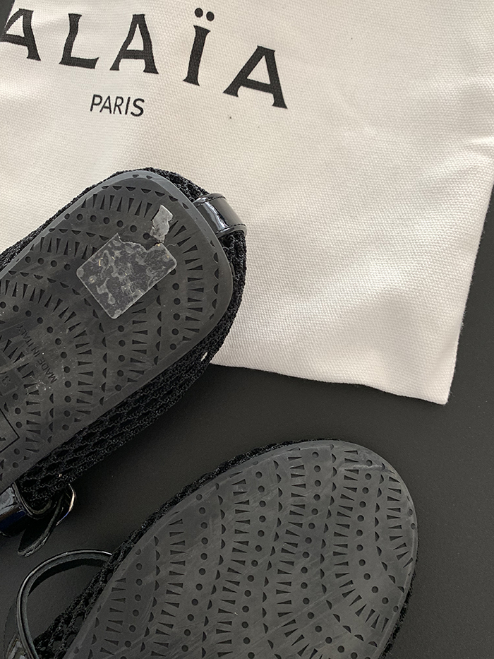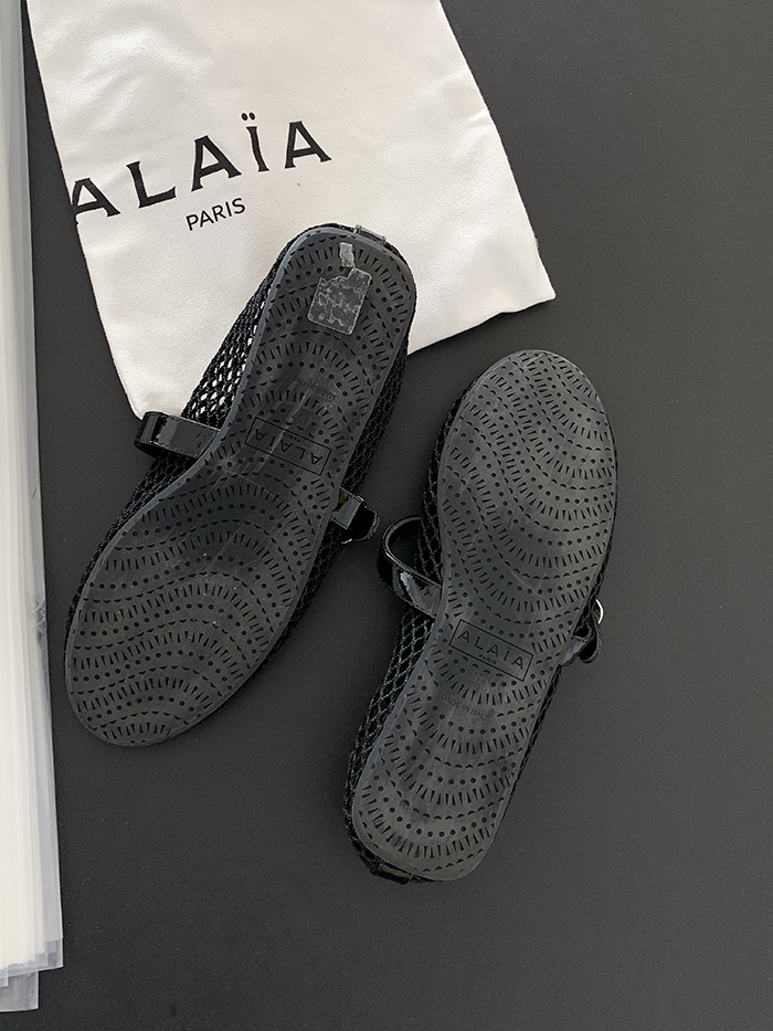 - material : Buckle straps at the top, round toes, rubber soles / Fishnet fiber and patented leather