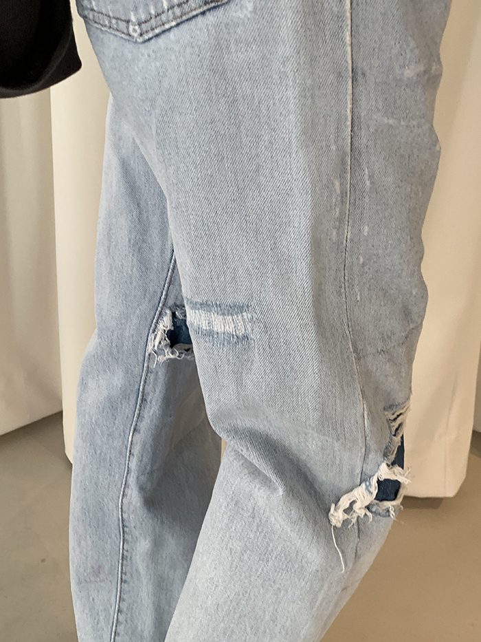 착용 시 슬림 스트레이트 핏이며 신축성이 없는 논스판 제품입니다.
