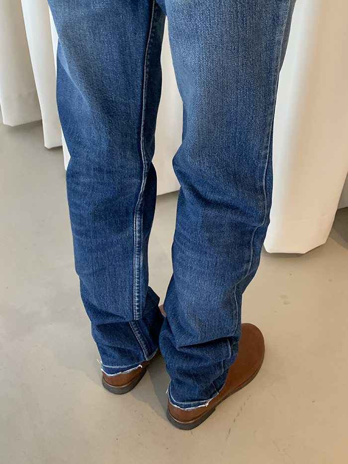 착용 시 슬림 스트레이트 핏이며 신축성이 없는 논스판 제품입니다.