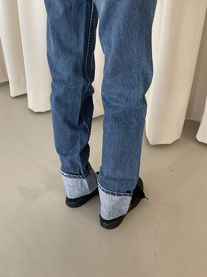 착용 시 클래식한 스트레이트 핏이며 신축성이 없는 논스판 제품입니다.