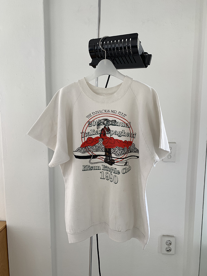 기존에 소개 드렸던 "20th Annual ltalian Spaghetti 🍝 lilisun Bicycle Club 🚴🏻" 귀여운 나염을 Vintage 50/50 USA Sweatshirt 에 작업을 한 제품입니다. 뒷부분에 lilisun 나염이 추가되었습니다 🍋